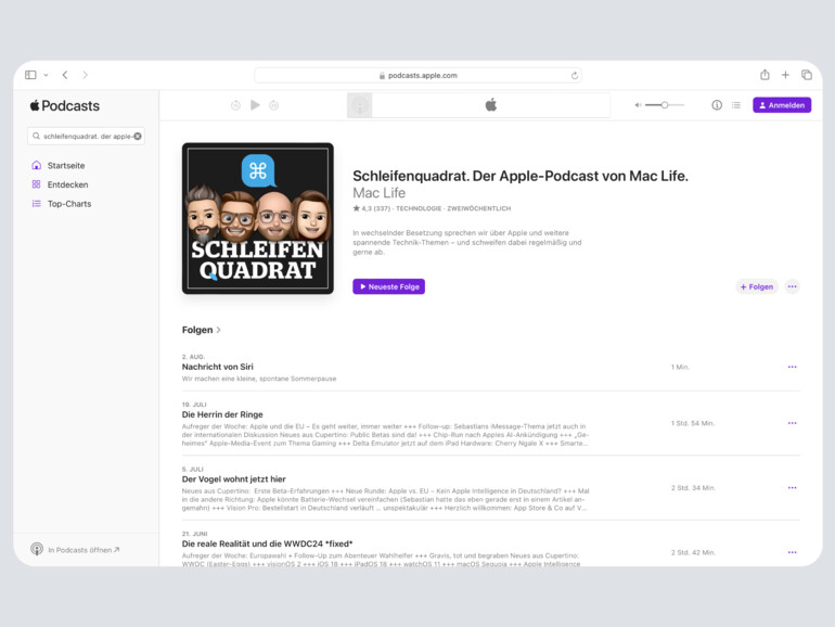 Die Funktion arbeitet ähnlich wie die Apple-Podcasts-App. Damit können Nutzende nicht nur Podcasts hören, sondern auch Sendungen abonnieren und Updates erhalten. Apple hat schon länger eine Webfunktion für Podcasts angeboten, die es erlaubte, diese in Artikel eingebettet zu hören. Neu ist jedoch die eigens entwickelte Website für Geräte ohne Podcasts-App.