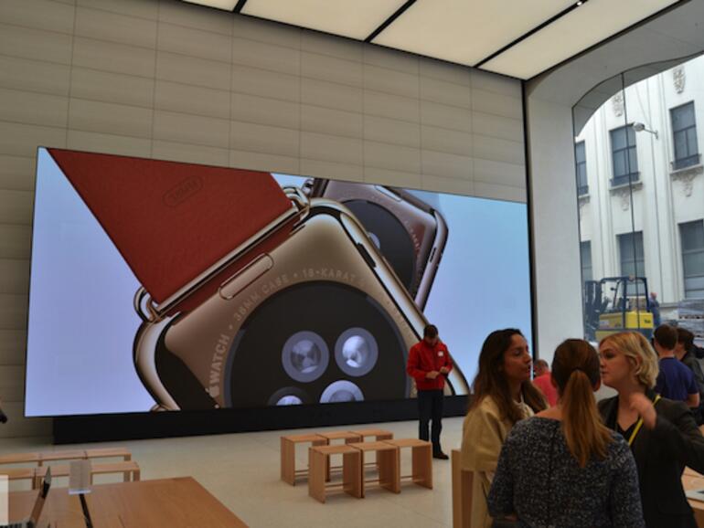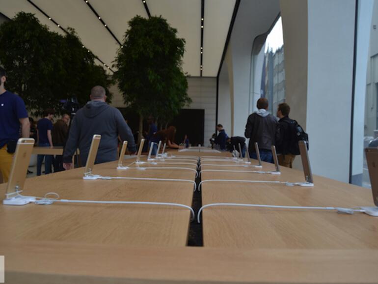 Auch die Präsentations-Tische sehen nun anders aus. Apple hat auf das Weiß als Holzfarbe verzichtet und stattdesssen ein bräunliches Holz verwendet. Die Tische selbst verfügen über einen Spalt in der Mitte, durch den die Kabel für Strom und Alarmanlage laufen