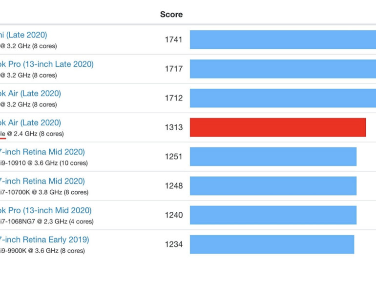 Besonders bemerkenswert ist allerdings, dass man damit sogar einen 27" iMac (2020) mit Intel Core i9 mit seinen 3,6 GHz hinter sich lässt. Im Multi-Core-Test lag man hingegen dahinter, da durch Rosetta 2 etwa 20 bis 25 Prozent an Leistung verloren gehen und der Unterschied schon deutlich geringer ausfiel, da Apples M1 nur über vier Performance- und vier Effizienz-Kerne verfügt.