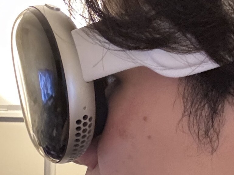 Wenn du das Vision Pro auf diese Weise trägst, hast du ein größeres effektives Sichtfeld, da der Abstand zwischen den Augen des Nutzers und den Linsen des Headsets geringer ist. Außerdem lastet deutlich weniger Gewicht auf dem Gesicht, wenn das Headset ohne den Verschluss getragen wird.