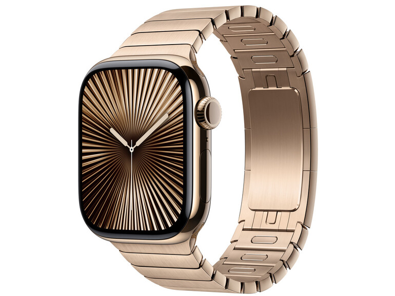 Das neue Gliederarmband Gold ist eine Ergänzung zu den bereits verfügbaren Varianten in Natur und Schiefer. Es wurde speziell entwickelt, um farblich perfekt zur Edelstahl-Apple Watch Series 10 in Gold zu passen. Gefertigt aus hochwertigem 316L Edelstahl, verspricht das Armband nicht nur einen luxuriösen Look, sondern auch Langlebigkeit im Alltag.