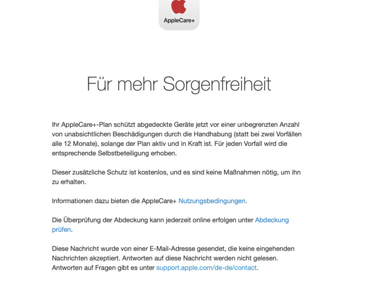 Update: Apple hat in einer E-Mail an Bestandskunde:innen mit einem aktiven Apple Care+ Vertrag klargestellt, dass die Änderungen ab sofort für alle aktiven Verträge gilt, egal ob neu oder alt. In der ursprünglichen Version des Beitrags hatten wir berichtet, dass die neuen Bedingungen für neue Verträge ab dem 7.9.2022 gelten.