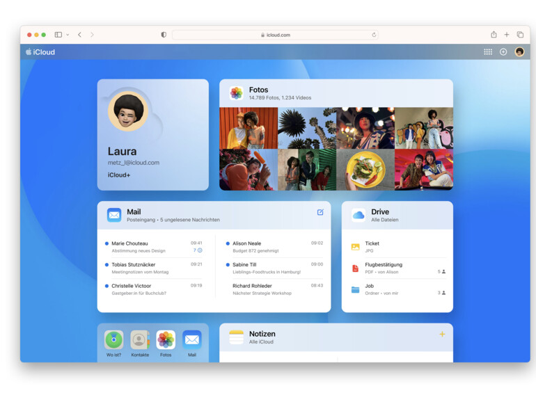iCloud erfordert iOS 5 oder neuer auf dem iPhone 3Gs oder neuer, iPod touch (3. Generation oder neuer), iPad Pro, iPad oder neuer, iPad Air oder neuer, iPad mini oder neuer, einen Mac mit OS X Lion 10.7.5 oder neuer oder einen PC mit Windows 7 oder Windows 8 (der Zugriff auf E‑Mails, Kontakte und Kalender erfordert Outlook 2007 oder neuer oder einen aktuellen Browser). Einige Funktionen erfordern iOS 16, iPadOS 16 und macOS Ventura. Einige Funktionen erfordern eine WLAN Verbindung. Einige Features sind nicht in allen Ländern oder Regionen verfügbar. Bei einigen Services ist der Zugriff auf 10 Geräte beschränkt.