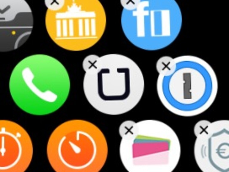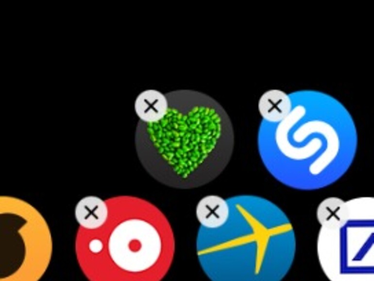 Alternativ zum Weg über die iPhone-App kann man Apps auch ähnlich wie bei iOS Geräten löschen. Von der Uhr gelangen Sie mit einem Druck auf die digitale Krone in den App-Screen. Dort tippen Sie mit Ihrem Finger solange auf einen belieben Icon, bis die Symbole anfangen zu wackeln. Alle löschbaren Apps sind nun oben links mit einem kleinen Kreuz versehen. Nun wählen sie die zu entfernende App aus, drücken auf das Kreuz und bestätigen kurz Ihre Auswahl. Nach wenigen Sekunden ist die App von Ihrem App-Screen verschwunden. Mit einem Druck auf die Krone wird der Screen wieder fixiert und lässt sich normal benutzen.