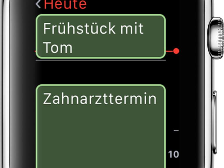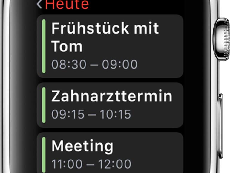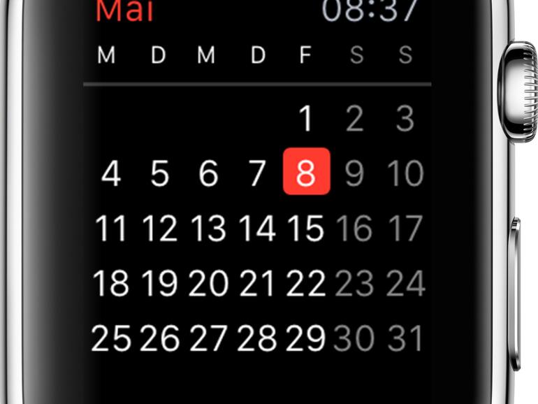 Der Kalender auf der Apple Watch ist sehr begrenzt und gibt einem zunächst einen Monatsüberblick (1). Mit einem Tipp auf den jeweiligen Tag erhält man zusätzlich eine Auflistung kommender Termine (2). In dieser Ansicht kann man mittels festen Force-Touch-Druck auf das Display (3) auch in die Tagesansicht (4) wechseln. Hier erhält man genauen Überblick über das Tagesprogramm und kann besser anstehende Termine und Lücken einsehen.