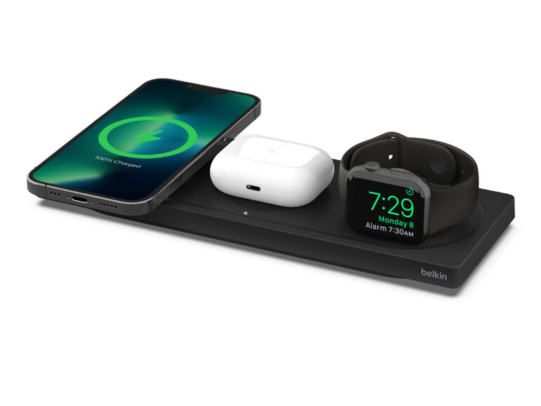 Viele Nutzer:innen haben mehr als nur ein iPhone. Oft kommt noch ein iPad, ein Mac sowie die Apple Watch und AirPods hinzu, die alle geladen werden wollen. Die beiden letztgenannten Geräte können mit Belkins neuer Ladematte gemeinsam mit dem iPhone geladen werden. Dieses unterstützt die Schnelllade-Funktion für das iPhone 12 und iPhone 13, da es auf Apples zertifizierten MagSafe-Standard setzt, der eine Ladegeschwindigkeit von bis zu 15 Watt erlaubt. Wie der Zubehörhersteller mitteilt, ist es auch mit MagSafe-Hüllen kompatibel, sodass du sie zum Laden nicht abnehmen musst.