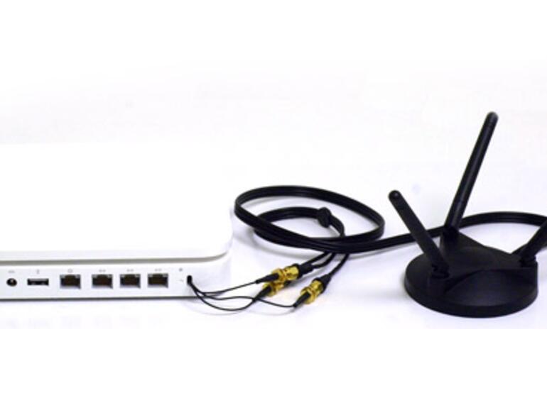 Deshalb hat der Entwickler heute eine externe Antenne für die Apple-Basisstation vorgestellt. Mit deren Hilfe soll sich die Reichweite der drahtlosen Netzwerkverbindungen um bis zu 50 Prozent verbessern lassen. Die Lösung besitzt drei 802.11n-fähige Metalldorne auf einem Sockel, die das Signal verstärken und damit auch weiter entfernt platzierten Computern die WLAN-Kommunikation mit der Basisstation ermöglichen.