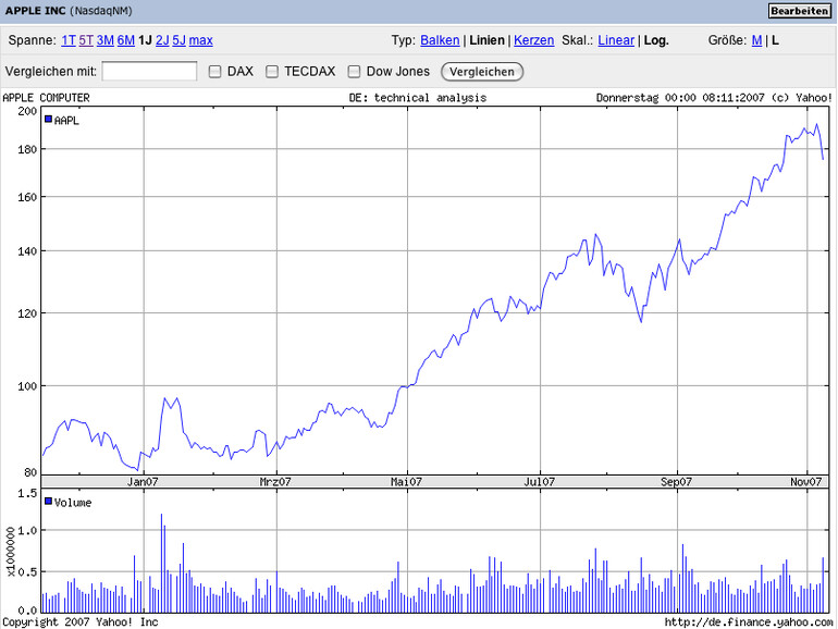 Die Stimmung an den Aktienmärkten ist dieser Tage durch Unsicherheit geprägt: Hatten einige Investmentbanker bereits das Ende der durch Kreditkrise bei den US-Banken ausgelösten Turbulenzen verkündet, so holten die Ausläufer der Abschreibungen die Börsen wieder ein. Vor einer Woche hatte die Citigroup bekannt gegeben elf Milliarden US-Dollar abschreiben zu müssen, die Aktie stürzte ab und zog andere Bankaktien mit in den Abwärtsstrudel. Gestern schließlich nannte Netzwerkausrüster Cisco seine Zahlen für das vergangene Quartal, die im Grunde sehr positiv ausfielen. Aber Anleger zeigten sich durch die Ankündigung des Cisco-Chefs John Chambers verunsichert, der für die kommenden Quartale mit einem Gewinnrückgang rechnet; Aufträge von US-Firmen, vor allem den Banken, blieben aus, nannte er als Grund für seine pessimistischere Sicht. Anleger folgerten daraus, dass sich die Bankenkrise auf den gesamten Markt ausbreite und stießen Papiere aus dem Hightech-Sektor ab. Somit wurde Apple einfach in Sippenhaft genommen, Grund zur Panik bei Apple-Aktionären besteht nicht. Schließlich hat das Papier in der jüngeren Vergangenheit fortlaufend neue Rekorde aufgestellt, daher kommt in einem unsicheren Markt die eine oder andere Gewinnmitnahme gerade recht.
