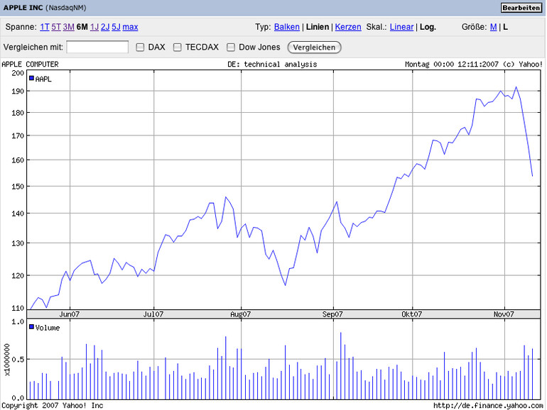Im Grunde nichts. Apple kommt an der Unsicherheit der Märkte derzeit nicht vorbei. Aufgrund der durch die Hypothekenkrise in den USA erwarteten Effekte auf die übrige Wirtschaft sind viele Anleger nervös und nehmen ihre Gewinne mit, schließlich soll es zu den baldigen Festtagen auch Geschenke geben. Hinzu kommt, dass der Start des iPhone in Europa nicht die Euphorie ausgelöst hat, wie es Ende Juni in den USA der Fall war; zwar sind die Verkaufszahlen sowohl in Großbritannien als auch in Deutschland gut, aber manche verwöhnte Analysten hatten anscheinend mehr erwartet: Ein Analyst bezeichnete den europäischen iPhone-Start als "enttäuschend", was auch ein Grund für den gestrigen Kursrückgang von sieben Prozent sein mag.