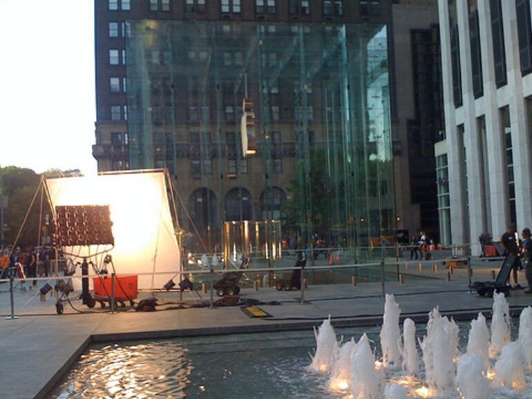 Die Dreharbeiten finden sowohl rund um den Store als auch in ihm statt. Dazu wurde das Gebiet rund um den Glaswürfel abgesperrt. Mit von der Partie waren natürlich Apple-Store-Mitarbeiter, Sichtschutze und jede Menge Scheinwerfer. Wir sind gespannt, ob man den Spot auf der WWDC sehen wird.