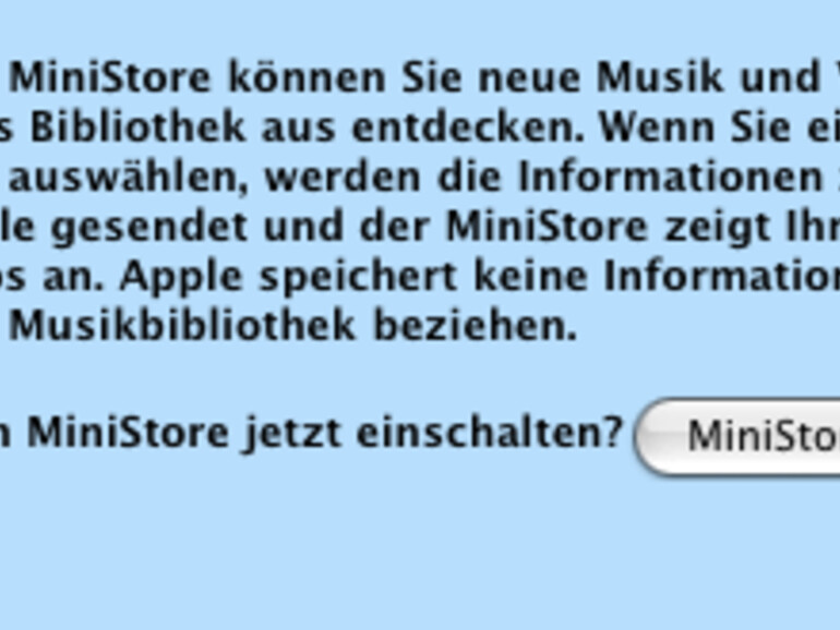 "Mit dem iTunes MiniStore können Sie neue Musik und Videos direkt von Ihrer iTunes Bibliothek aus entdecken. Wenn Sie ein Element in Ihrer Bibliothe auswählen, werden die Informationen zu diesem Element an Apple gesendet und der MiniStore zeigt Ihnen ähnliche Titel oder Videos an. Apple speichert keine Informationen, die sich auf den Inhalt Ihrer Musikbibliothek beziehen.