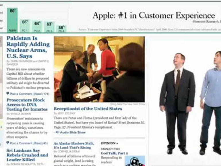 Auf der Präsenz der New York Times sieht es zunächst so aus, als würde Mac sich allein auf eine Umfrage verlassen, die seine Kundenfreundlichkeit preist. Doch als der PC meint, lieber noch weitere Meinungen einholen zu wollen, meldet sich plötzlich der Haarlose aus dem Banner gegenüber. Auch er und sein auf wundersame Weise neu bewachsener Kollege können noch diverse andere Vorteile aufzählen, wie Virusfreiheit, Mac Genius und mehr.