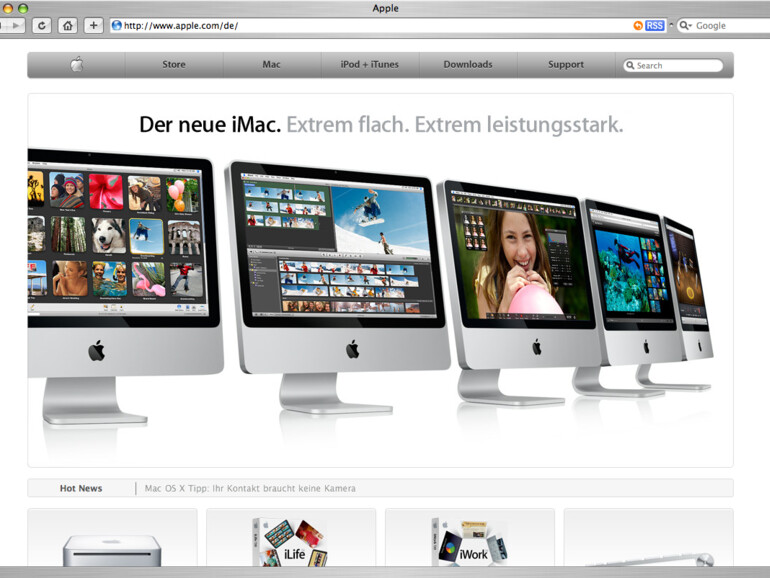 In einigen Monaten müssen die Navigationspunkte Store, Mac, iPod+iTunes, Downloads und Support etwas zusammenrücken, denn dem iPhone wird wie auf den US-Seiten eine Präsenz im Menü spendiert. Teil der Navigation ist die neue Suchfunktion, die bereits während des Tippens Ergebnisse präsentiert. Die Dashboard-Widgets sind im neuen Design stärker in die Downloads integriert, letztere Rubrik ist nur teilweise übersetzt und verweist zum Teil auf die englischsprachigen Seiten.