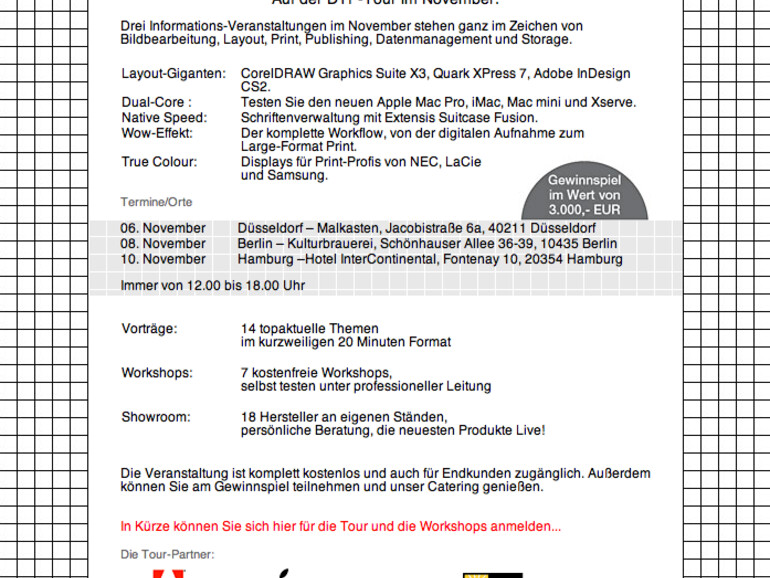 Corel mit CorelDRAW Graphics Suite X3 und dem brandneuen Paint Shop Pro PHOTO XI, Quark mit QuarkXPress 7 erstmals als Universal Application und Adobe mit der kompletten Adobe CS2 Familie. Selbstverständlich ist auch Apple mit von der Partie und zeigt neben den neuen, superschnellen Rechnern auch sein Post-Production Tool für Fotografen: Aperture.