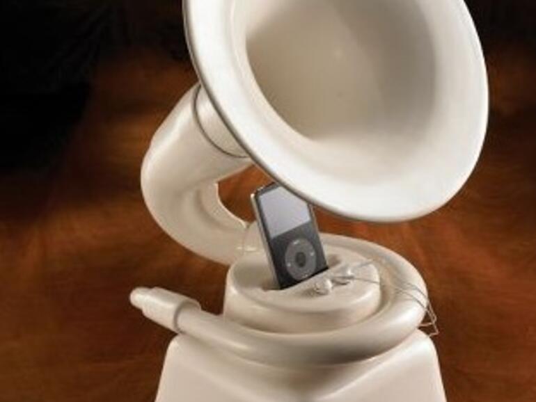 Das iPod-Grammaphon von Hammacher Schlemmer eignet sich für alle iPod-Modelle und wird mit Adaptern für die Ohrhörer ausgeliefert. Das Gerät besteht aus Keramik und kann für knapp 500 US-Dollar über die Hammacher-Schlemmer-Homepage geordert werden. (via tuaw)