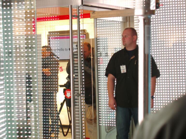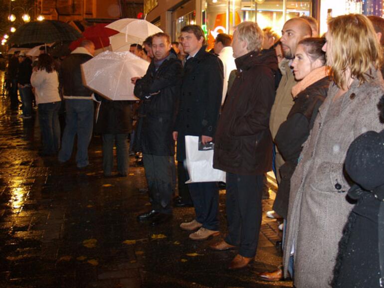 Regen tat guter Laune keinen Abbruch. Große Schirme und Heizstrahler waren aufgebaut, Telekom-Mitarbeiter verteilten warme Decken, praktische Kaffeebecher und Regenschirme. Zur Stärkung wurden Tee, Kaffee und Brezeln ausgeteilt. Eine Security regelte den Zustrom in den Laden, was durchaus notwendig war. Zunächst wurde die geladene Presse eingelassen, dazu dann immer wieder ca 5-10 Kunden gleichzeitig. Am Einlass herrrschte stets dichtes Gedränge, und Jubelrufe wurden laut bei neuen Vorstößen und ersten glücklichen Kunden, die den Laden wieder verließen. Die Kunden wollten so schnell wie möglich nach Hause, um die neuerstandenen Geräte zu aktivieren.