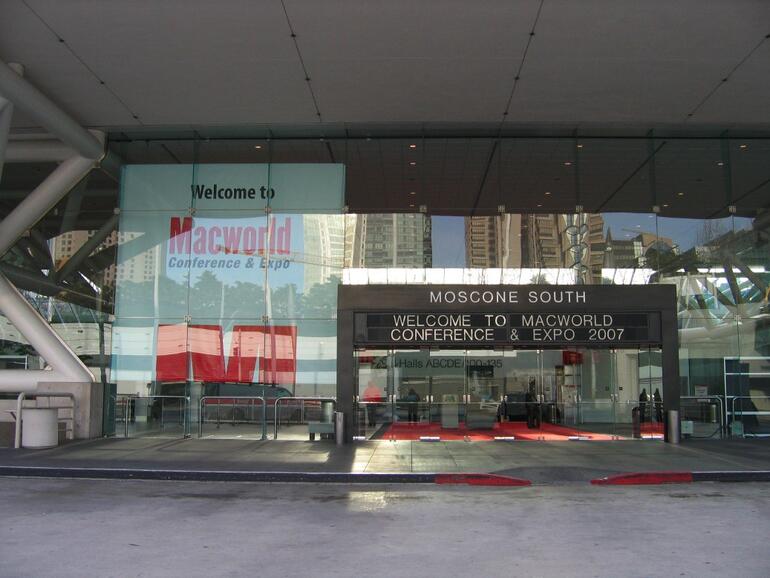 Noch laufen die Vorbereitungen auf Hochtouren: LKWs bringen Material, Sicherheitsleute patrouillieren das Messe-Zentrum, Plakate werden angebracht. Einige einsame Mac-Fans haben bereits jetzt den Weg zum Moscone Center gefunden und riskieren einen Blick durch die große Glasfront.