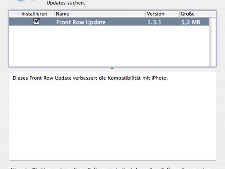 Laut Apples Angaben verbessert die Aktualisierung die Zusammenarbeit von Front Row mit iPhoto. Da Apple keine Versionsnummer angibt, kann man davon ausgehen, dass die Verbesserungen für alle iPhoto-Versionen gelten und nicht nur für das jüngst veröffentlichte iLife '08.