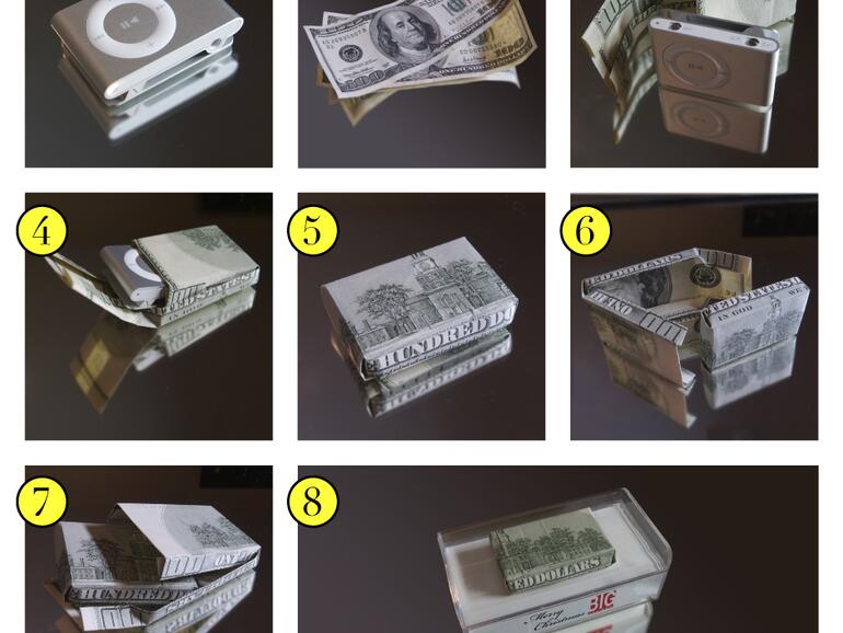 Mit der Anleitung auf dem beigefügten Bild ist es möglich, den iPod shuffle auf Origami-Art in einen Geldschein einzubauen, so dass das Geschenk interessanter wird.