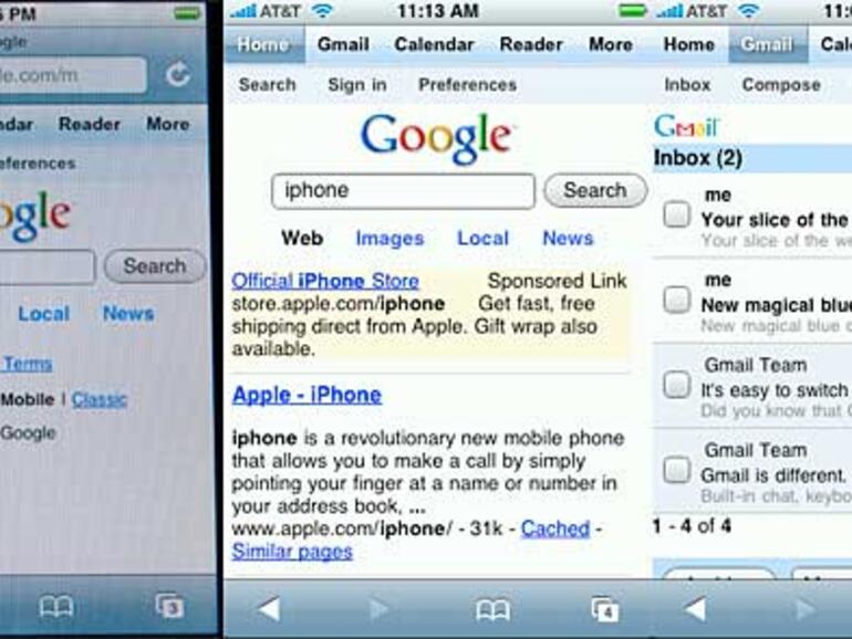 So bietet etwa die Suchseite eine vielfach geringere Ladezeit und wird auf dem iPhone gleich von Anfang an größer als die "klassische" Variante dargestellt. iPhone-Nutzer können überdies mithilfe einer am oberen Seitenrand integrierten Leiste direkt zu den wichtigsten Google-Diensten GoogleMail, Google Calendar und Google Reader navigieren, ohne umständlich in die Seite hineinzoomen zu müssen. Die Anpassungen erfolgten bei allen der genannten Google-Webapplikationen und sind nur über das iPhone und den iPod Touch zu betrachten.