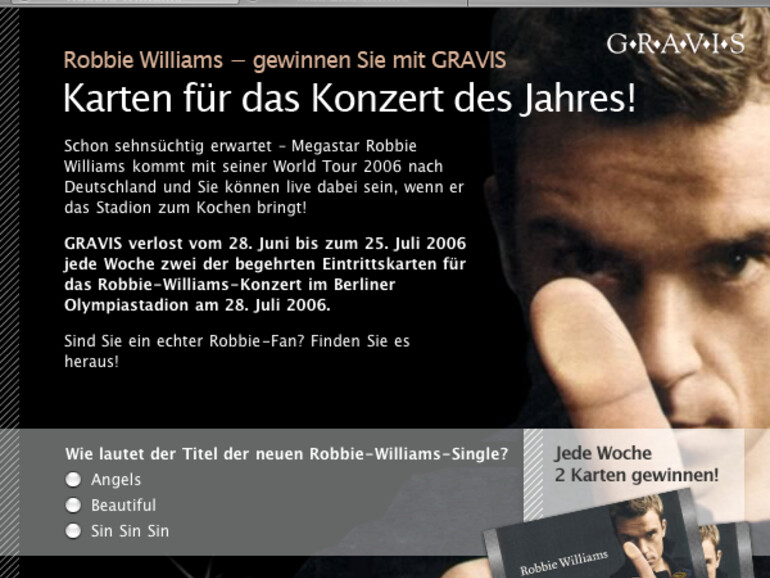Laut GRAVIS ist es das Musikevent des Jahres: Wer kein Ticket mehr für die Welttournee des Megastars ergattern konnte, hat nun die Gelegenheit, doch noch den Adrenalinspiegel an die Grenzen zu treiben.GRAVIS verlost bis zum 25. Juli 2006 jede Woche unter www.gravis.de zwei Tickets für das Musikevent des Jahres am 28. Juli 2006 im Berliner Olympiastadion.