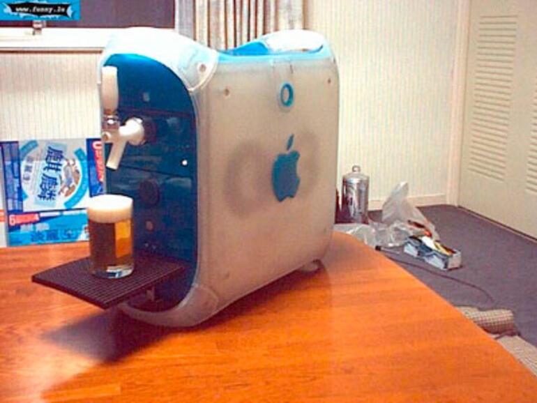 Wie das Foto beweist (danke fürs Einschicken, Matz R.) kann dann das Bier aus dem richtigen Behältnis fließen und wer will legt obenauf noch gleich die passende Kopfweh-Tablettensammlung. Natürlich kann der PowerMac aber auch für andere Alkoholica aus dem Mac (und nicht der Dose) umgebaut werden. So kann heute Abend eigentlich nichts mehr schief gehen - egal für welche Mannschaft man ist!