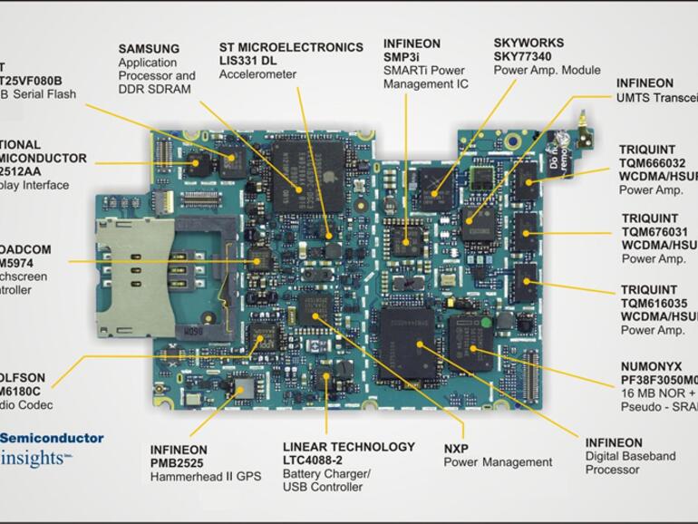 Zunächst fällt auf, dass die bisherigen zwei Platinen im Inneren durch eine einzelne ersetzt wurden. Hierauf stammen nicht nur die GSM-Einheit, auch Teile der Strom-Versorgung und sogar das GPS aus dem Hause Infineon. Im Unterschied zu der Lösung des Vorgängermodells sei der GPS-Chip bis auf wenige Meter genau und vermeide unpräzise Ortungen, so Techonline.com. Diese könnten durch Reflektionen des Signals an hohen Gebäuden auftreten. Eine weitere Erkenntnis, die sich aus der Zerlegung des iPhone 3G ergibt, betrifft den Speicherhersteller.