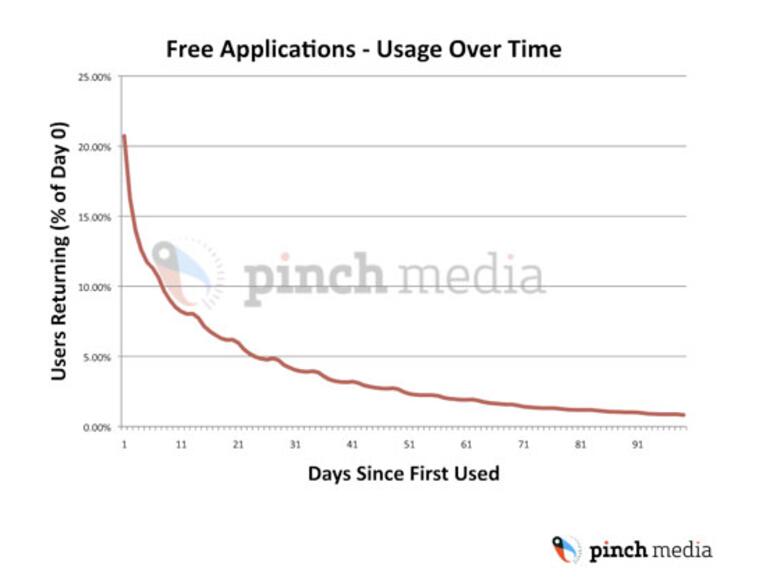 Dieser Frage sind die Analysten von Pinch Media auf den Grund gegangen und liefern die überraschende Antwort: 80 Prozent der Apps haben eine Halbwertszeit von weniger als einem Tag, einen ganzen Monat halten es sogar nur 5 Prozent der Nutzer mit demselben Programm auf ihrem Gerät aus.