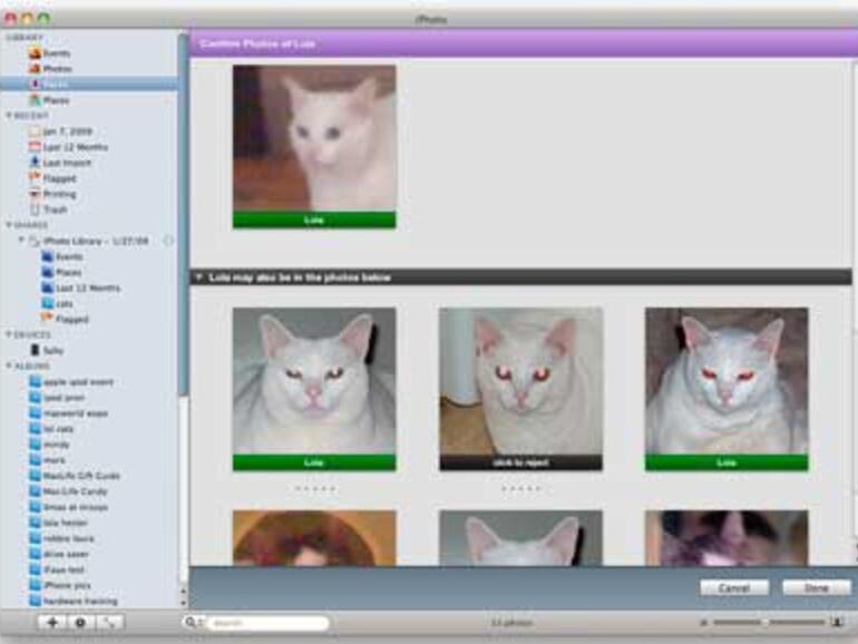 Ein Beispiel dazu liefert MacLife.com, die anhand von Katzenbildern die erstaunlichen Fähigkeiten des Programms demonstrieren. Sind die einzelnen Katzen erst einmal getaggt, also eindeutig für die Software erkennbar, funktioniert die weitere Erkennung automatisch. Damit entspricht die Tiererkennung der Erkennung menschlicher Gesichter. Und es tut sich ein neues Einsatzgebiet von iPhoto '09 in der Biologie auf ...