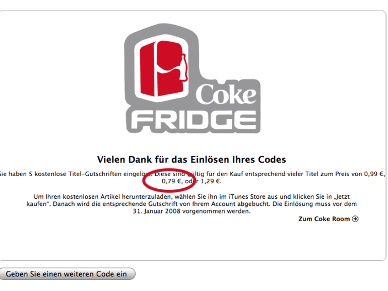 Nach Recherchen von fscklog wird die niedrigere Zahl auch im Schweizer Coke-Fridge-Bereich angegeben, so dass man nicht mehr von einem Rechtschreibfehler ausgehen kann. Viel wahrscheinlicher ist, dass es bald schon Titel im iTunes Store geben wird, die nur 0,79 Euro kosten werden.