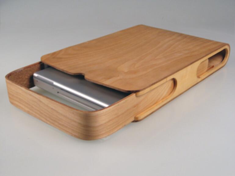 Der Designer stellt auf seiner Internetseite noch einige andere Projekte vor, denen jeweils eine pfiffige Idee zugrunde liegt. In diesem Fall wurde das Problem der sicheren Unterbringung eines Laptops auf originelle Weise gelöst. Durch die Kork-Polsterung ruht das Gerät stoßsicher in der Verpackung aus poliertem Holz. Das Projekt war als Experiment gedacht, mit dem Kelly die Arbeit mit gebogenem Sperrholz ausprobieren wollte. Käuflich zu erwerben ist das Ergebnis daher leider nicht.