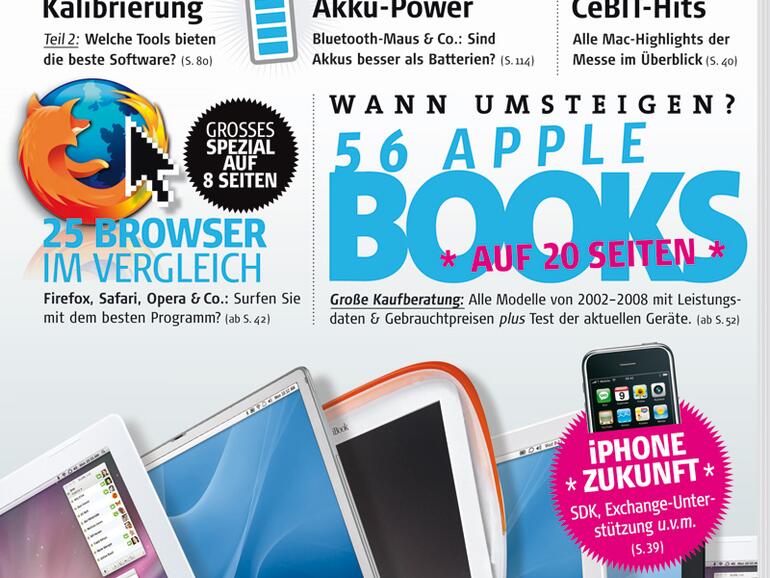 Auf 19 Seiten präsentieren wir Ihnen einen Vergleich aller Leopardfähigen iBooks, PowerBooks, MacBooks und MacBook Pros der vergangenen vier Jahre in Ausstattung und Leistung. Dazu geben wir Zusatzinformationen wie eine Gebrauchtpreisliste, spezielle Notebook-Tools und vieles mehr. Natürlich sind auch Tests der aktuellen MacBook- und MacBook-Pro-Modelle enthalten.