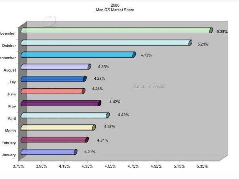 Auf Basis von Messungen durch das Unternehmen Net Applications haben die Betreiber der Website mit dem deutlich Position beziehenden Namen switchtoamac.com errechnet, dass der Marktanteil von Macs weltweit im November 2006 bei 5,39 Prozent lag. Damit sei der Anteil im Vergleich zum November des vergangenen Jahres um 31 Prozent gestiegen.Weitere Zahlen, Tabellen und Erklärungen finden sich auf folgender Seite: