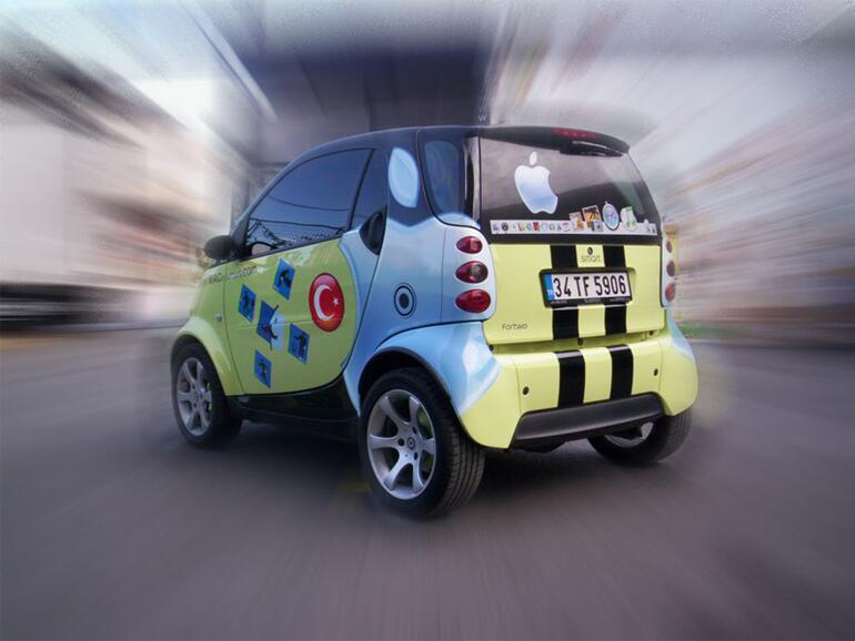 Doch ein wahrer Fan begnügt sich nicht nur mit dem Innenausbau. Auch das Äußere soll die Verbundenheit zum Mac zeigen. Sprach's und lackierte den Smart wie eine Werbetrommel für Apple: Das Logo rechts und links, und zusätzlich kam auf die Heckscheibe das uns allen bekannte Dock mit aufgeblähtem Safari- und iTunes-Symbol. Ein echtes Fan-Auto eben.