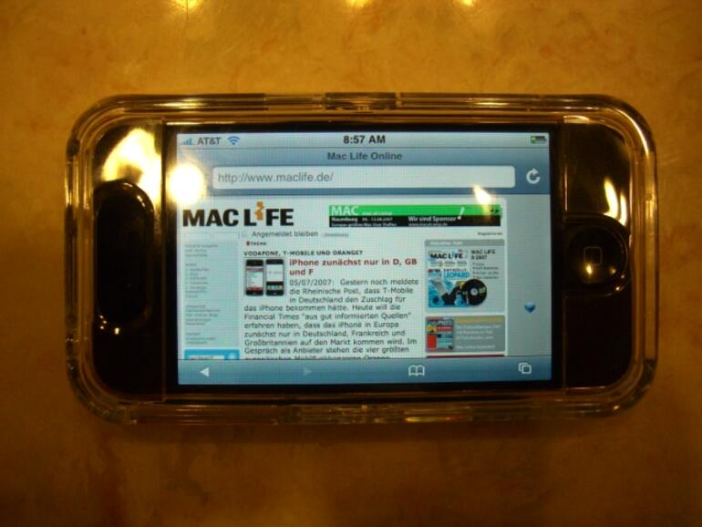 Unser Leser Oliver aus Florida hat uns Bilder der Mac-Life-Seite auf seinem neuen iPhone gesendet. Vielen Dank dafür.Wie zu sehen ist, stellt iPhone-Safari die Seite genau so dar, wie sie auch auf den konventionellen Internetseitenbetrachtern erscheint. Auch die Drehung aus der Horizontalen in die Vertikale macht einen guten Eindruck. Damit das Telefon keine Kratzer abbekommt, schützt Oliver das Gerät mit einer Kunststoffhülle.