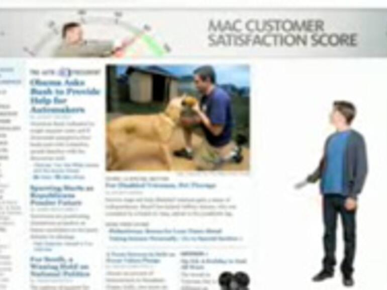 Dazu klettert die von John Hodgman verkörperte PC-Figur einfach vom rechts gelegenen Werbebanner in den darüber liegenden, in dem die "Mac-Kundenzufriedenheit" mit einem Zeigerausschlag beinahe 100 Prozent anzeigt. Doch der Versuch, den Zeiger nach rechts gen Null zu bewegen scheitert. Und so endet das ganze wieder einmal in einem doch sehr kläglichen Versuch, dem Mac eins auszuwischen.
