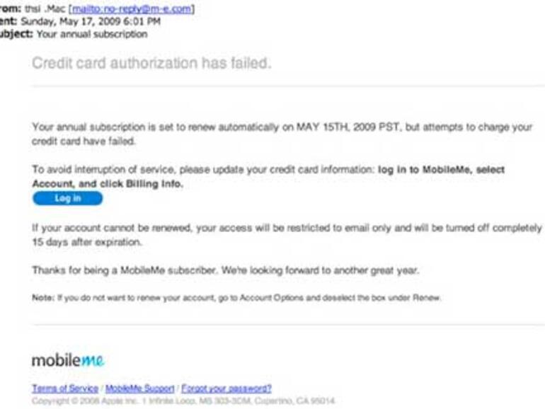 MobileMe-Kunden in den USA haben in den letzten Tagen eine täuschend echt wirkende E-Mail des MobileMe-Teams erhalten, in der behauptet wurde, die angegebenen Kreditkarteninformationen seien falsch und man möge sie bitte korrigieren. Dazu wurde ein Button angezeigt, der die Benutzer wohl auf eine Seite führen sollte, auf der er seine Daten eingeben - und dann an dubiose Quellen weiterleiten sollte. Denn Apple verschickte diese E-Mail nicht.