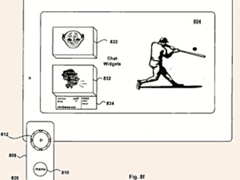 Dazu will Apple laut des Patentantrags die Front-Row-Funktionalität des Apple TV insofern erweitern, dass man sich während einer Live-TV-Übertragung (die bis dato noch gar nicht auf dem Apple TV zu empfangen ist) auch andere Informationen ins Bild einblenden kann oder sich zeitgleich mit eingeblendeten Chatpartnern über die Fernsehsendung unterhalten kann. Apple nimmt als Beispiel eine Sportsendung, in der die Spielergebnisse zu sehen sind oder gechattet wird. Wie bei der Videokonferenzfunktion soll dann auch bei der TV-Übertragung das Bild sich in drei Bereiche einteilen lassen können.