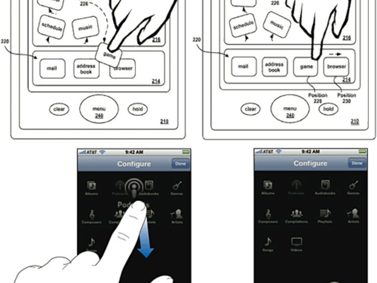 Doch die Rechtsabteilung Apples weiß auch diesmal weiterzuhelfen: Ein kürzlich aufgetauchtes Patent aus Cupertino gibt Hinweise auf mögliche neue Funktionen. Die Anmeldung beschreibt eine Technik zum Anordnen von Bedienelementen auf einem Touchscreen per Drag & Drop. Dabei verhalten sich die Symbole wie die Programme im Dock von Mac OS X: immer hübsch animiert weichen sie neuen Programmsymbolen aus, schließen durch herausgezogene Symbole entstandene Lücken und folgen dem Mauszeiger, respektive Finger, beim Verschieben.