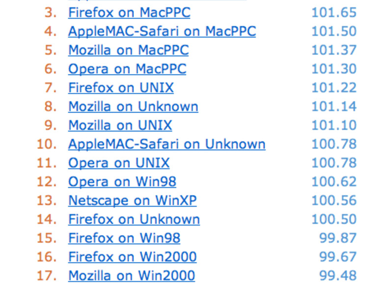 Derzeit werden die ersten sechs Plätze von Mac-Anwendern belegt, vor allem PowerPC-Mac-Anwender tun sich insbesondere hervor. Im englischsprachigen Test dazu werden zehn Fragen zur Allgemeinbildung, rechnerischen und geometrischen Fähigkeiten gestellt. Aus den gegebenen Antworten errechnet die Seite im Anschluss eine Punktzahl.