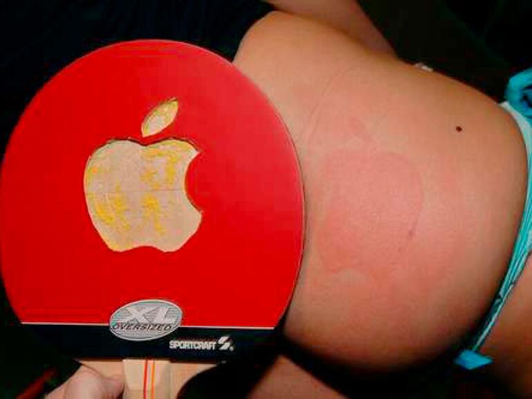 Notwendig dazu ist nur ein ausgedienter Schläger, das Apple-Logo als Vorlage und ein Schnitzmesser. Jetzt das Apple-Logo aus der Mitte ausschneiden und dann die Zähne zusammenbeißen und kräftig auf ein geeignetes Körperteil klatschen. Schon ist das Apple-Logo rot glühend zu sehen. Von Dauer ist das aber nicht und so fragt sich der geneigte Nutzer, ob es nicht einfacher wäre, sich das Logo mit Henna oder anderen geeigneten Mitteln aufzumalen.