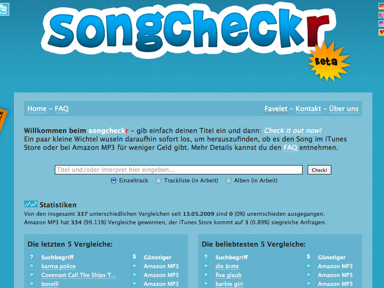 songcheck[r] ist ein Preisvergleich für Musik. Vorerst noch für einzelne Songs, aber später auch für Alben werden iTunes und Amazon verglichen. Dabei hat Amazon für die meisten Titel die niedrigeren Preise. Wer auf jeden Cent achtet, sollte auf der Website vergleichen. Der Preisvorteil beträgt meistens nur ein oder zwei Cent, es stecken also nicht immer die Plattenlabels dahinter, wenn iTunes über das teurere Angebot verfügt.