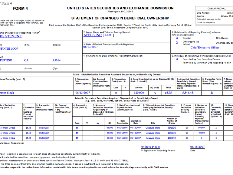 Würde Steve Jobs die so neu erworbenen Aktien jetzt sofort verkaufen, wozu er das Recht hätte, würde er beim gegenwärtigen Aktienkurs über 13 Millionen US-Dollar Gewinn einstreichen. Doch derzeit scheint es noch keine derartigen Transaktionen an der Börse zu geben. Sicher ist, dass Steve Jobs damit jetzt 5.546.451 Aktien von Apple (AAPL) inne hat. Dies entspricht derzeit umgerechnet einem Vermögen von über 700 Millionen US-Dollar. Seine Aktienanteile bei Pixar und anderen Firmen natürlich nicht mit eingerechnet.