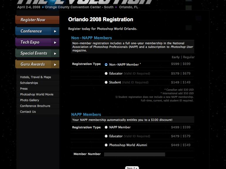 Anwender, die nicht Mitglieder der NAPP sind, zahlen zwischen 599 und 699 US-Dollar. In dieser Registrierung inbegriffen ist eine einjährige Mitgliedschaft und ein Abo des Photoshop-User-Magazins. Studenten zahlen für einen Besuch der Veranstaltung 149 US-Dollar.