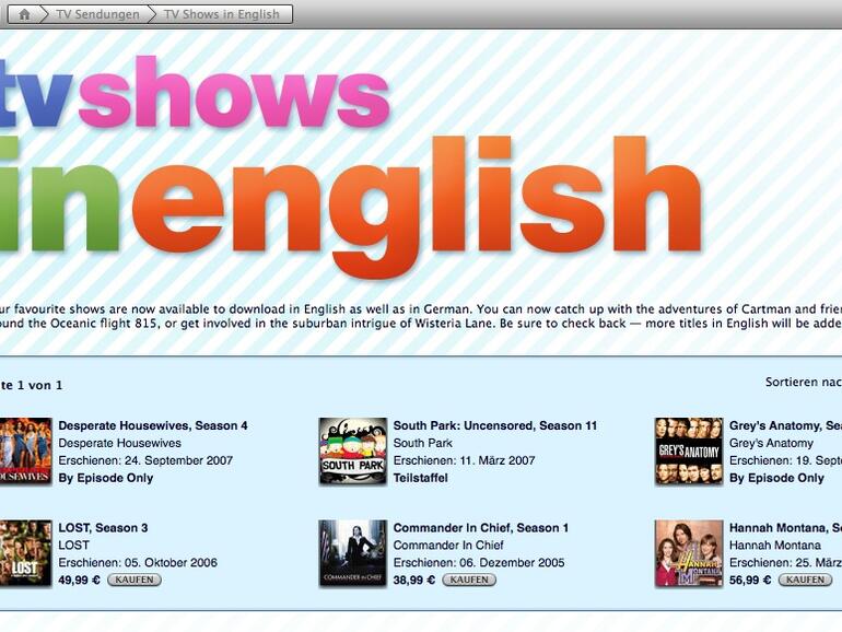 Derzeit finden sich nur einzelne Staffeln bekannter Serien in der originalsprachlichen Version im Sortiment. Unter anderem werden die Serien "Desperate Housewives (4. Staffel), Lost (3. Staffel) und South Park (11. Staffel) in Englisch angeboten. Weitere Serien und Staffeln sollen in jedoch Kürze folgen. Nicht unbedingt nachvollziehbar ist allerdings, warum es nach wie vor keine Möglichkeit gibt eine Folge oder ganze Staffel mit beiden Tonspuren (Deutsch und Englisch) zu kaufen.
