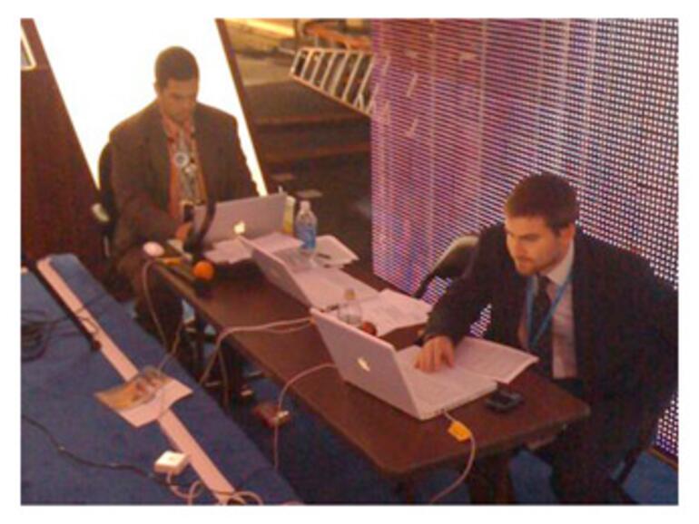 Auch hinter den Kulissen wurde es interessant. Ein TUAW-Leser machte mit seinem iPhone Fotos von Angestellten, die die großen Videowände im Pepsi-Center während des "Democratic National Convention" über Macs steuerten. Je nachdem welche Person der Menge entgegen sprach, änderten die Kollegen die Namen auf den Leinwänden mit Apple-Notebooks und trugen damit zum reibungslosen Ablauf bei.