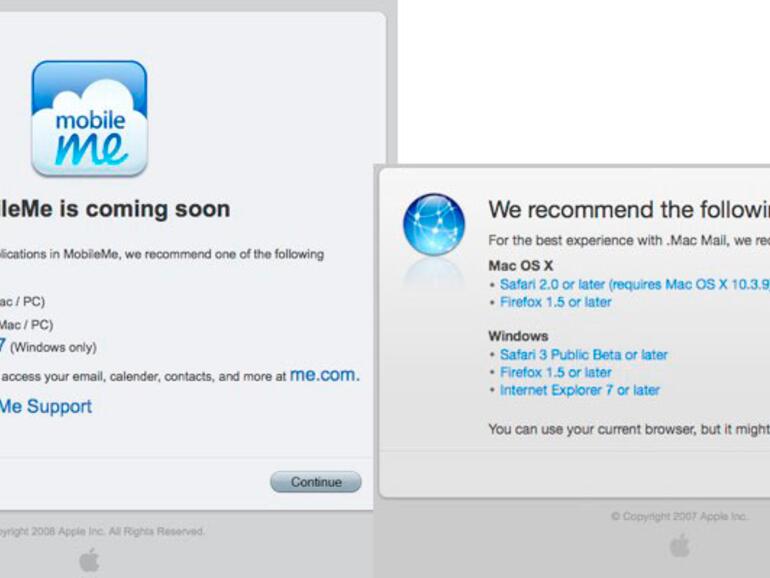 In einer kurzzeitig zur Verfügung stehenden Veröffentlichung (gefunden von TUAW) nannte das bald erscheinende MobileMe dabei als Voraussetzung zur Nutzung Safari ab Version 3, Firefox ab Version 2 und unter Windows den Internet Explorer 7. Inzwischen findet man an dieser Stelle aber wieder die Voraussetzungen für den DotMac-Zugang, die wesentlich niedriger angesetzt sind: Unter Mac OS X Safari 2 oder Firefox 1.5 und unter Windows Safari 3, Firefox 1.5 und Internet Explorer 7 oder höher.