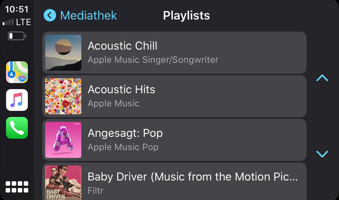 Im direkten Vergleich mit dem Vorgänger hat Apple viele Details von CarPlay überarbeitet. Dies fällt bereits links in der Navigationsleiste auf. Dort wanderten Uhrzeit, Empfangsanzeige und Ladestand des iPhones (fahrzeugabhängig) von der Mitte nach ganz oben. Dafür wanderten die drei zuletzt verwendeten Anwendungen besser erreichbar in die mittlere Position. Darunter ist nun nicht mehr der Home-Button zu finden, sondern dieser wich einem zweireihigem Icon-Symbol, das jedoch ausgewechselt wird, sobald man sich auf dem Home-Bildschirm befindetDie Funktion ist dennoch gleich geblieben. Grundsätzlich sind auch die App-Ansichten deutlich runder geworden und erinnern endlich stärker an die Designs von Apples eigenen iOS-Apps.