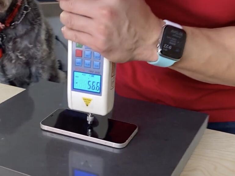 Der sogenannte Kraftmesser gibt als Messzahl Newton aus. Die Ergebnisse lauten: Das Display des iPhone 11 hält einer Kraft von 352 Newton stand, beim iPhone 12 sind es 442 Newton. Das war der Drucktest. Danach folgte ein Kratztest. Und der war alles andere als wissenschaftlich. Die Youtuber malträtierten das Display mit Alltagsgegenständen, wie Münzen und Steinchen und sogar einem Teppichmesser. Kratzer gab es beim iPhone 12 nicht.