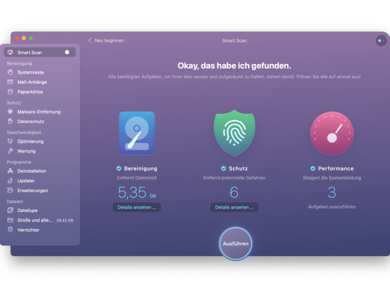 Dass CleanMyMac X so gute Bewertungen hat, liegt zum einen an der hochwertigen Software, die nicht mal eben zum schnellen Geldverdienen zusammengeschustert wurde, zum anderen aber auch an der Bandbreite der Fähigkeiten des Programms. Die Palette der Funktionen beginnt mit der essentiellen: CleanMyMac X entsorgt alle Daten, die in deinem Rechner überflüssig sind: veraltete Caches, Protokolle, fehlgeschlagene Downloads und vieles mehr. Das heißt: übersichtlich und nicht vorschnell zeigt dir die Software, welche Dateien wegkönnen, und erst, wenn du die endgültige Entscheidung über das Vernichten gibst, werden die entsprechenden Objekte mit Stumpf und Stiel und ohne unnötige Überreste eliminiert. Auch iTunes, Fotos oder Mail kannst du sekundenschnell von unnützem Ballast befreien. Angst davor, wichtige Dateien zu verlieren, musst du nicht haben, denn das Programm kann elementare Inhalte von überflüssigen unterscheiden. Zur Sicherheit sorgt ein intelligenter Assistent dafür, dass du immer die richtige Entscheidung triffst.